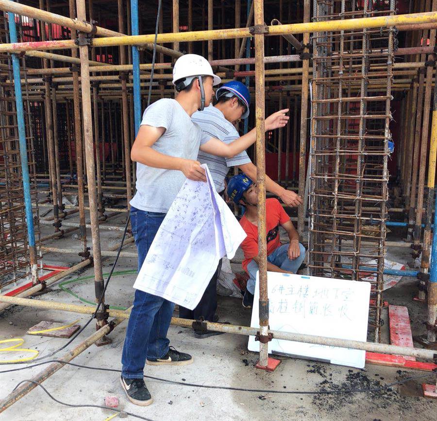 6月18日,在桂華分公司承建的梧州佛子時代廣場項目現(xiàn)場,當空烈日讓偌大的工地一片熾熱,焊花飛濺,工程車來來往往,工人們揮汗如雨。雖然施工作業(yè)已經(jīng)避開了高溫時段,但工人們?nèi)员缓顾粤搜劬?,濕了衣服。盡管這樣,大家仍堅持“全副武裝”,手套、防護用具,安全帽,一樣都沒有少,自覺遵守安全文明施工相關(guān)規(guī)范。入行兩年的施工員趙俊財抹了一把汗說道:“剛參加工作時,不能和家人一起過節(jié)還挺難受的,后來把心態(tài)調(diào)整好了,想著只要家人安好,其實比什么都重要,趁著年輕,還是應(yīng)該多奮斗?!笨粗幻装舜髠€的他手拿圖紙和卷尺,蜷縮著身子,蹲在空間有限且熱得發(fā)燙的平臺上仔細檢查剛剛綁扎好的鋼筋籠,驕陽烤得他黝黑的皮膚泛出一層水光,襯著那還略顯年輕的臉龐,顯得熠熠生輝。