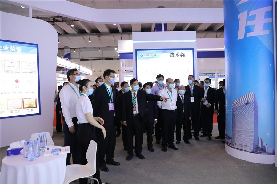 自治區(qū)住房和城鄉(xiāng)建設廳副廳長葉云(左二)、潘國雄(左三)一行到冶建公司展區(qū)參觀