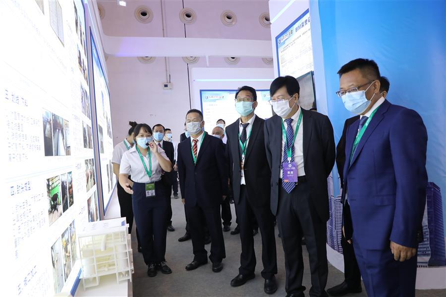 集團公司總經理、黨委副書記、董事羅濤(右二),海南省住建廳副廳長劉聯(lián)偉(右一)在冶建公司展區(qū)參觀