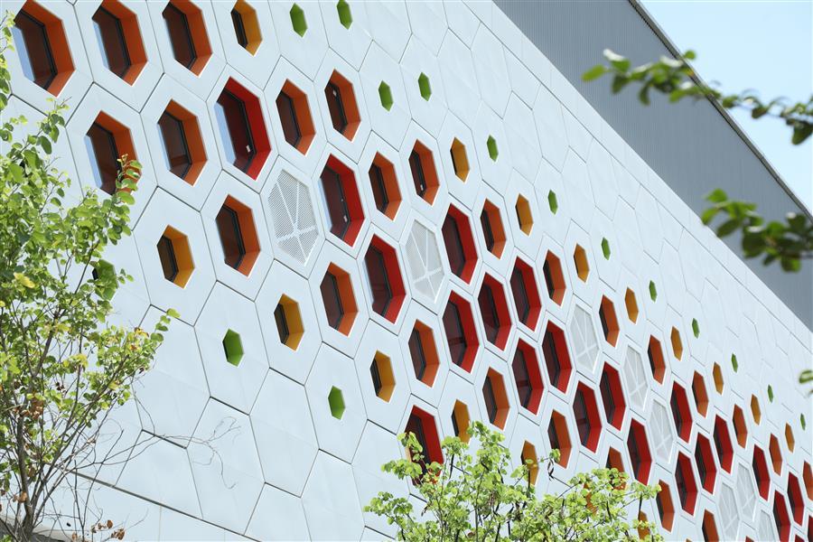 項目建筑外立面設計將柳州本土文化元素“紫荊花”與康恒公司“蜂巢”理念完美融合,多層次的幕墻肌理協(xié)同自然光線,在不同照射條件下呈現(xiàn)出多樣的光影效果,不僅呼應了垃圾焚燒發(fā)電精細的工藝流程,更體現(xiàn)了人與自然和諧共生的美好愿景。
