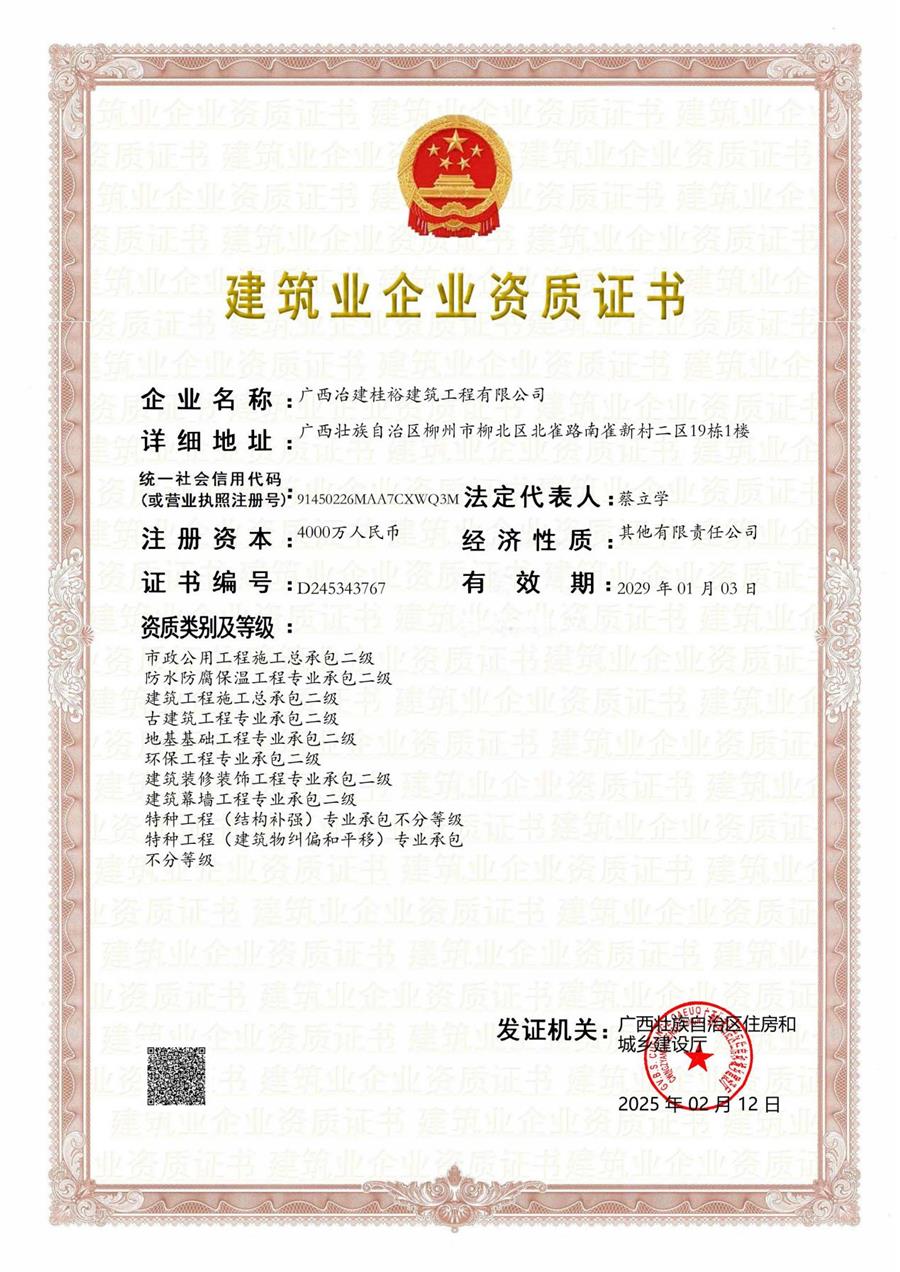 8項專業(yè)承包資質(zhì)分別是:防水防腐保溫工程、古建筑工程、地基基礎(chǔ)工程、環(huán)保工程、建筑裝修裝飾工程、建筑幕墻工程、特種工程(結(jié)構(gòu)補強)、特種工程(建筑物糾偏和平移)專業(yè)承包資質(zhì)。此批資質(zhì)將為桂裕公司后續(xù)的業(yè)務(wù)承攬、拓展區(qū)域市場提供有力保障,為冶建公司高質(zhì)量發(fā)展添磚加瓦。