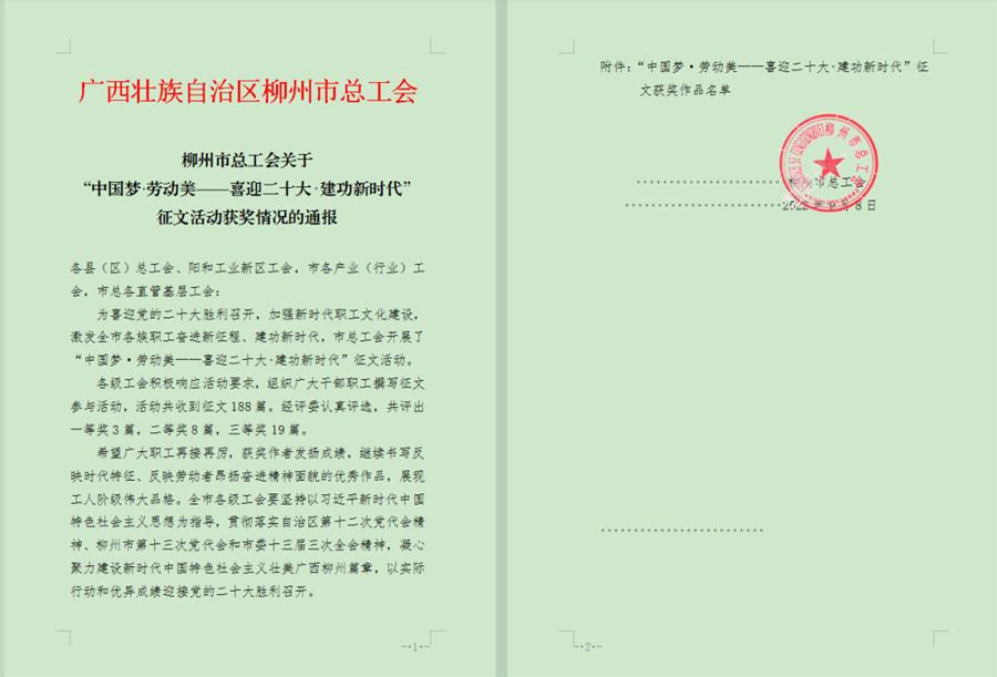 近日,柳州市總工會發(fā)布關于“中國夢?勞動美——喜迎二十大 建功新時代”征文活動獲獎情況的通報,冶建公司職工作品榮獲三等獎。